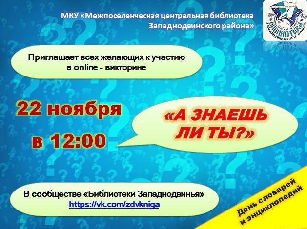 22 ноября в сообществе «Библиотеки Западнодвинья» пройдет игра «А знаешь ли ты?», посвященная Дню словарей и энциклопедий. Цель игры выявить эрудицию игроков, умение работать со справочной литературой и поисковыми системами.