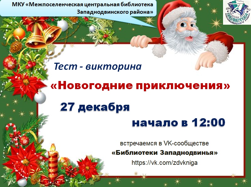 27 декабря в рубрике «Игра выходного дня» состоится новогодняя тест-викторина «Новогодние приключения», посвященная традициям и обычаям праздника в культуре разных стран. тест-викторина Начало игры в 12:00.
