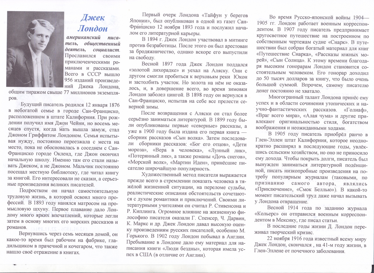 Предлагаем посмотреть виртуальную книжную выставку «Джек Лондон – кумир во все времена» , на которой представлены труды писателя, которые принесли ему мировую известность: «Белый Клык», «Мистер Иден», «Любовь к жизни» и др. Краткая характеристика произведений раскроет основной их смысл и заинтересует читателя.