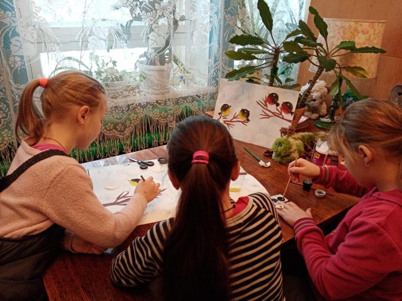 диски, цветную бумагу и акварель посетители смастерили аппликацию, где нашли место синички и снегири.