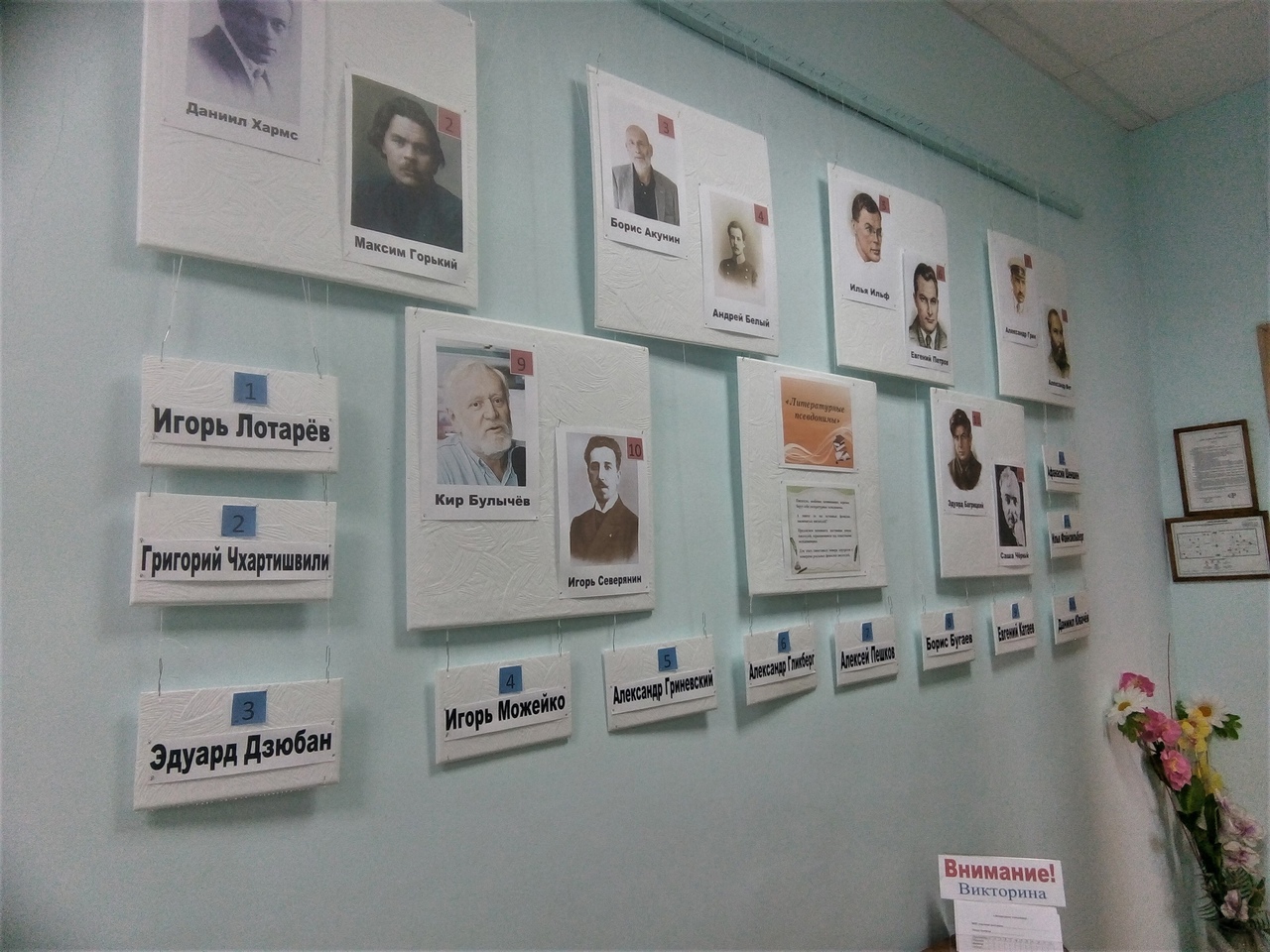 Каждый желающий проверить свои знания может, посетив библиотеку, заполнить бланк ответа, где достаточно сопоставить номер портрета писателя с номером его реального имени.