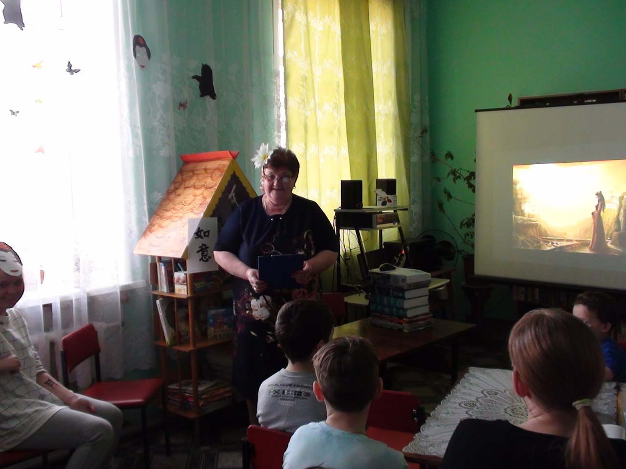 Потом все перебрались на поляну японских сказок, где все послушали сказки «Ивовый прутик» и «Кувшинный человек», приняли участие в отгадывании японских хокку, за правильные ответы вручали сувениры. А в фойе на протяжении всего вечера работал Тату-салон, где все желающие могли нарисовать себе на память о вечере японские иероглифы. В этот вечер для всех, кто пришёл в библиотеку, работало кафе, в меню которого были сладкие роллы. Вечер понравился гостям. До встречи на «Библиосумерках -2019».