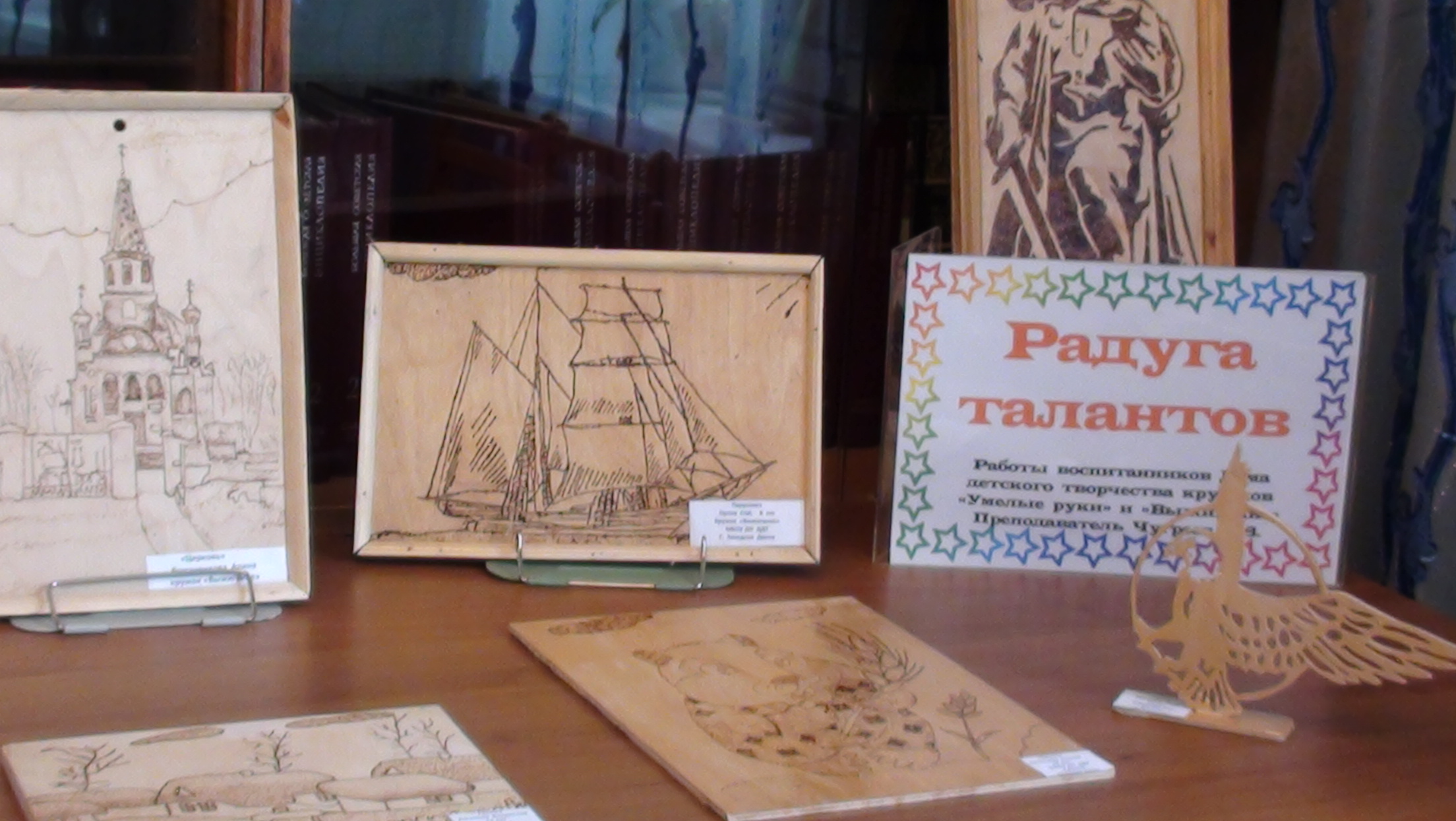 Под руководством преподавателя Чугреева Александра Васильевича ребята, которые посещают Дом детского творчества и занимаются в кружках «Умелые руки» и «Выжигание» знакомятся с приемами обработки фанеры, выбором и перенесением рисунка, выжиганием, раскрашиванием и тонированием. Выжигание стало любимым занятием не только мальчиков, но и девочек, в чем вы можете убедиться посетив выставку.