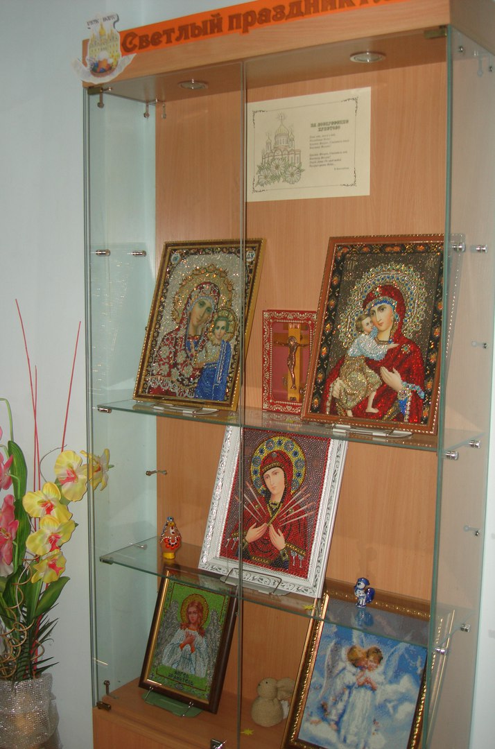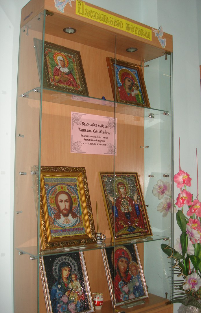 . Работы представленные в фойе центральной библиотеки выполнены в техниках вышивки бисером и алмазной мозаике. Познакомиться с выставкой можно до конца апреля.