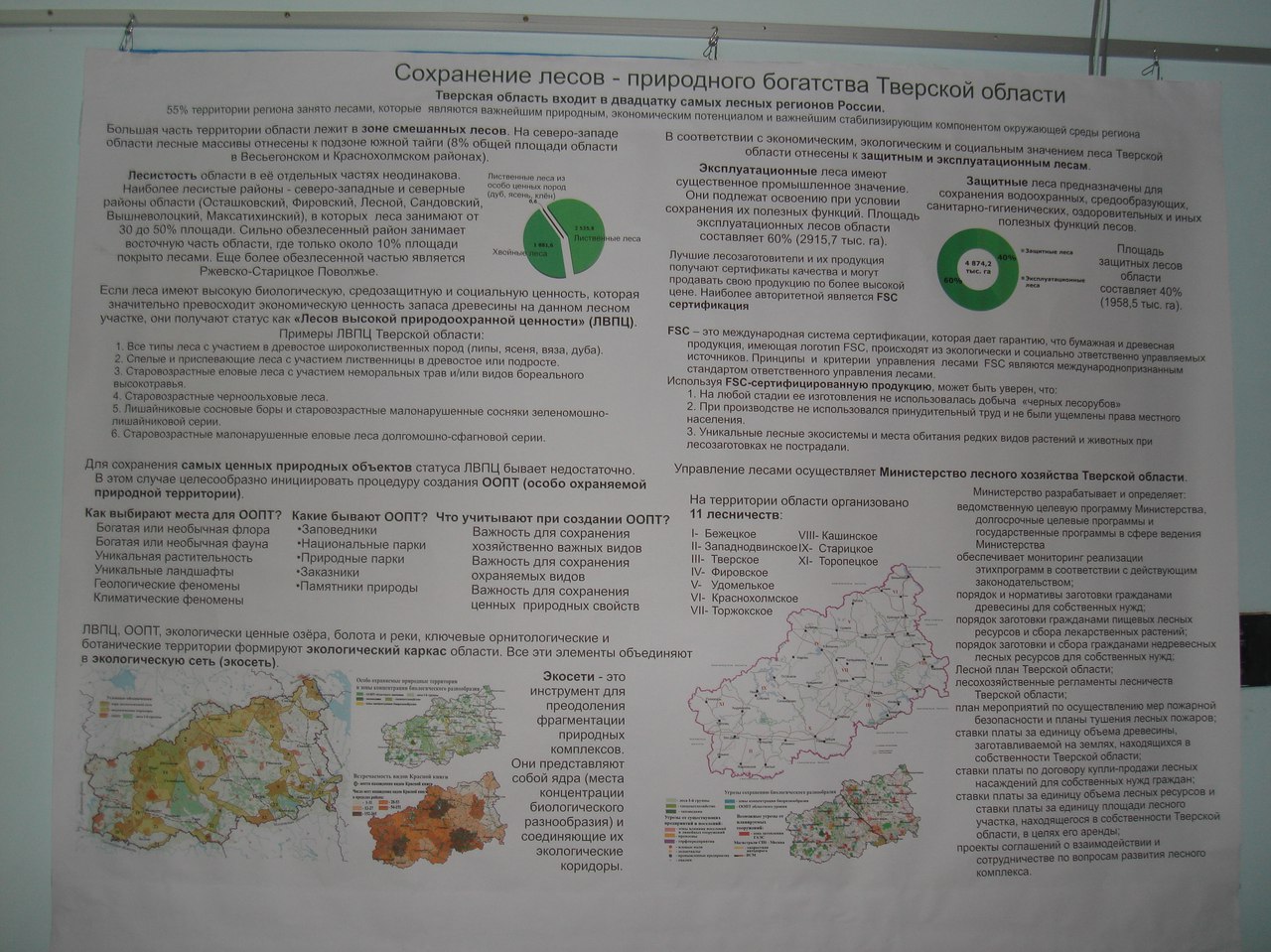 На выставке представлены фотографии леса, его флоры и фауны, сделанные в ходе занятий по изучению леса, походах учащимися станций юных натуралистов области. Отдельным разделом выставки стали творческие поделки местных мастеров из дерева, капа, сучков - Валерия Баженова и Сергея Фионова.