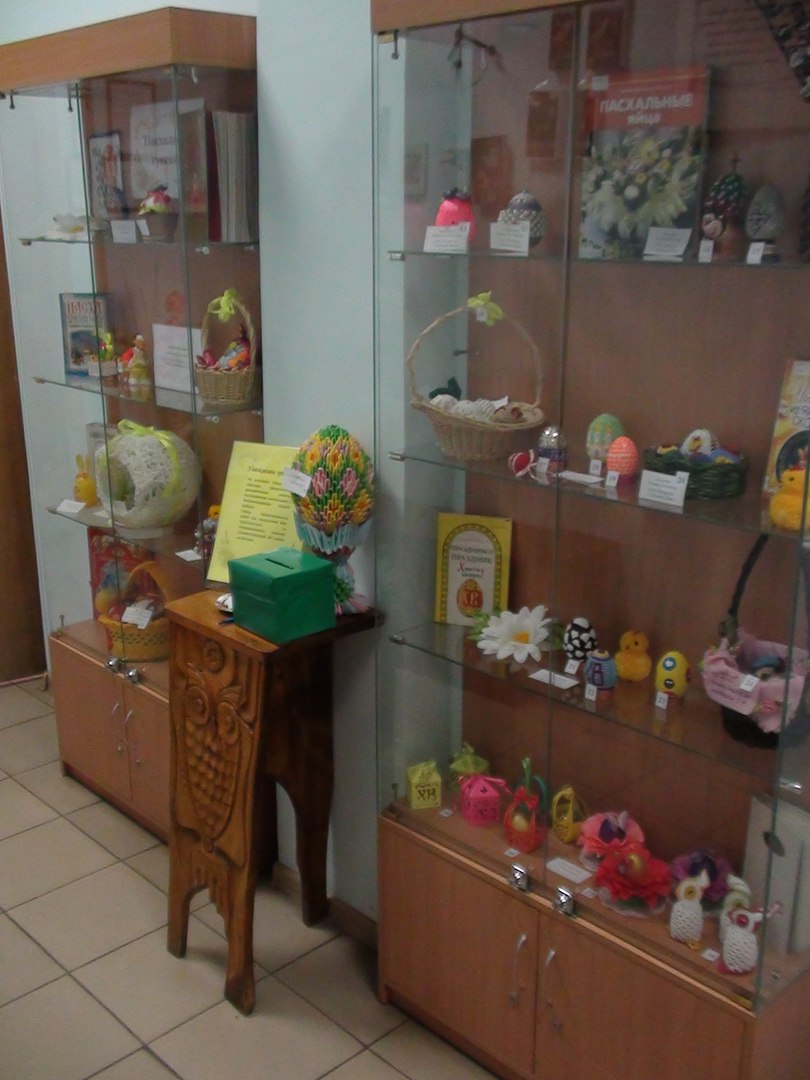 Представляем вам выставку поделок наших читателей и библиотекарей к Пасхальному празднику, которая размещена в фойе библиотеки.