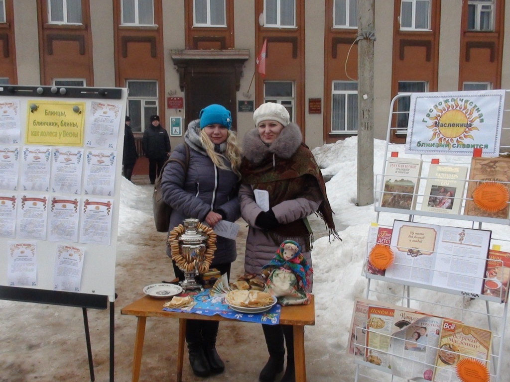 На Масленичных гуляньях, проходивших на главной площади города библиотека представила свою выставку "Госпожа честная Масленица блинами славится". Где выставили издания о кулинарных традициях празднования Масленица, а также познакомили с интересной подборкой необычных рецептов блинов. Всем желающим предлагали опробовать готовые блинчики приготовленные по этим рецептам.
