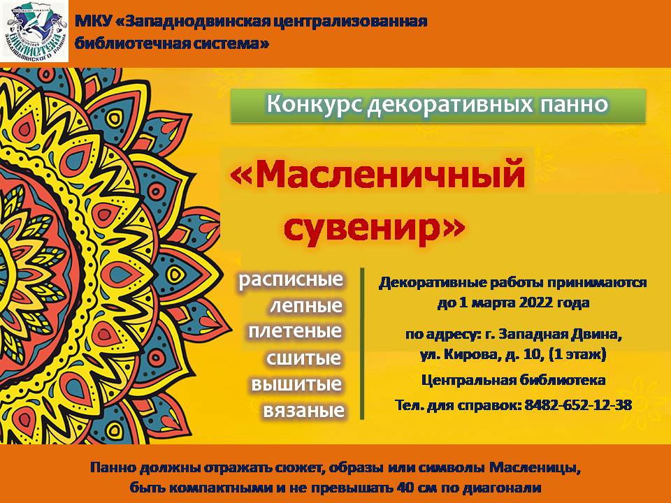 Центральная библиотека приглашает всех желающих к участию в творческом конкурсе «Масленичный сувенир». В конкурсе участвуют декоративные панно с сюжетом, образами и символикой Масленицы. Работы могут быть выполнены в любой технике рукоделия - лепка, роспись, лоскутное шитье, вязание, плетение и др. Приветствуется компактные панно не превышающие 40 см в диаметре, форма исполнения любая. Работы принимаются до 1 марта 2022 года по адресу: Центральная библиотека, г. Западная Двина, ул. Кирова, д. 10